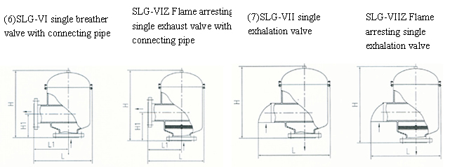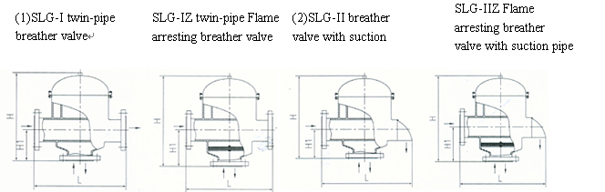Main technical specifications ◆Suitable to special liquid and gas of petroleum, chemical, medicinal energy engineering; ◆ Operating pressure: A: -295Pa (-30mmH2O) +355Pa (+36mmH2O) B: -295Pa (-30mmH2O) +980Pa (+100mmH2O) C: -295Pa (-30mmH2O) +1750Pa (+180mmH2O) D: -295Pa (-30mmH2O) +98000Pa (+10000mmH2O) ◆Explosion class; BS 5501:IIA、IIB、IIC ◆Shell material: Carbon steel Al. alloy, ◆Material of valve disc and seat: Al.alloy, stainless steel; ◆Sealing material: Tetrafluoroethylene; ◆Flange standards: HG20592-97 PN1.0. If the customer requires GB,HGJ, JB, ANSI,JIS or change pressure grade, clear it in the contract. ◆Manufacturing, test and inspection should be in accordance with standards: SY7511, 《Manufacturing, test and inspection of breather valve used for petroleum container 》, GB5908-1986 《Fire arrestment performance and test methods of arrestor used for petroleum container》. Product model and specifications