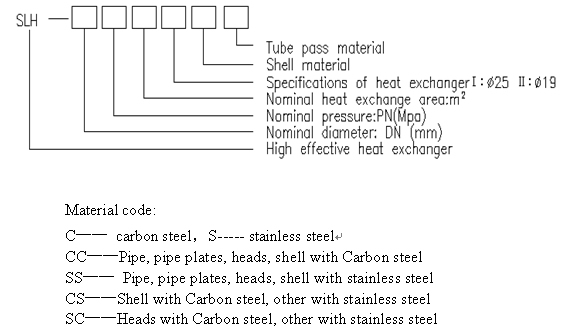 If nominal diameter is 300, nominal pressure is 1.0Mpa, heat exchange area is 9m2, the heat transfer tube is φ19 shell with carbon steel. The other heat exchanger is made with stainless steel. The model is shown as SLH300-1.0-9II-CS.