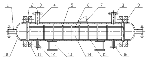 1.Pipe shell 2. Bolt 3. Nut 4. Pipe sheet 5. Baffle 6. Heat transfer tube 7. Ear support 8. Exhaust outlet 9. Flange 10. Head 11. Sheet 12. Drainage outlet13. Support 14. Pull-rod 15.Cylinder 16. Shell connecting pipe